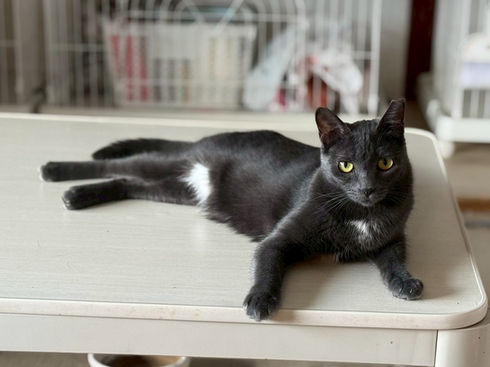 *現在人馴れ修行中です(2025年5月現在)。ほぼケージの中で身を潜めている状態で、食事も人が見ていない時に食べていますが時折ケージの外を覗いて他の猫に話しかけたりしています。撫でるとイカ耳になって体を縮めますが撫でさせてはくれます。手からチュールも食べる事ができています。